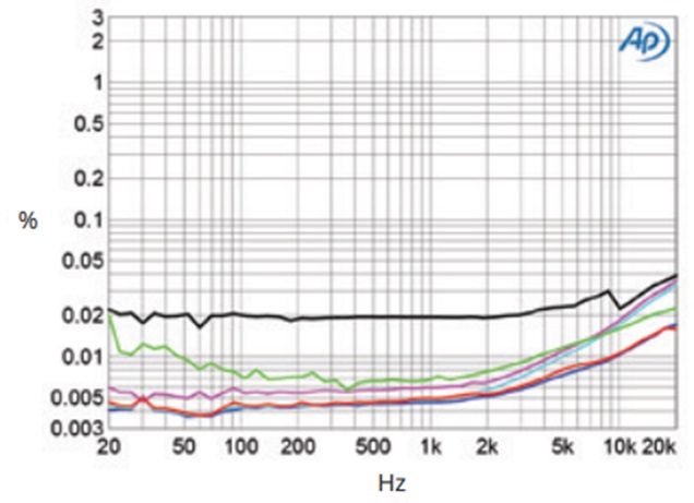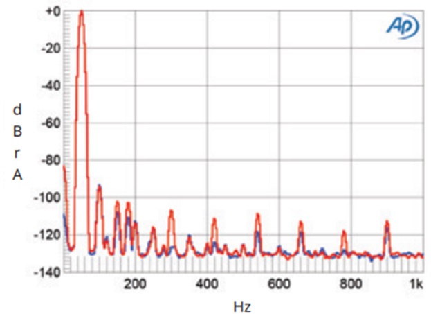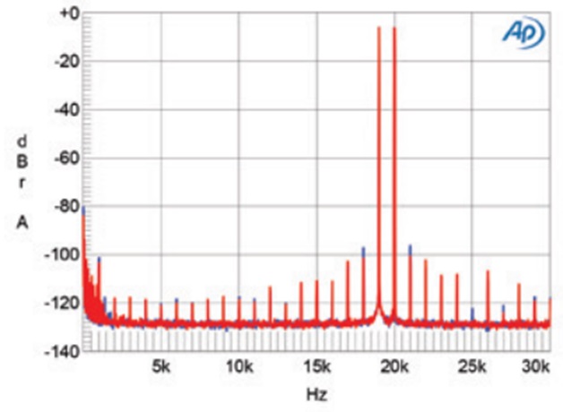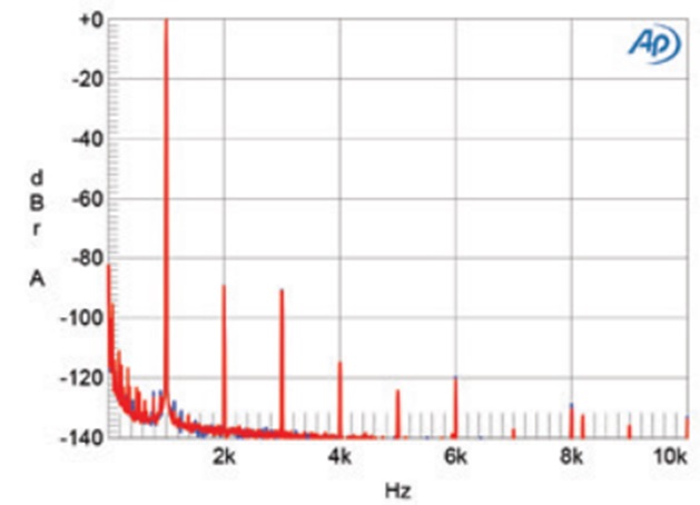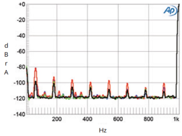 A fenti ábrán látható az 1 kHz-es szinusz jel harmonikus tartománya. 1W 8 ohm. Kék a bal, piros a jobb csatorna maximális hangerő beállításban. -20 dB hangerő beállítás esetében a bal csatorna zöld, a jobb szürke.