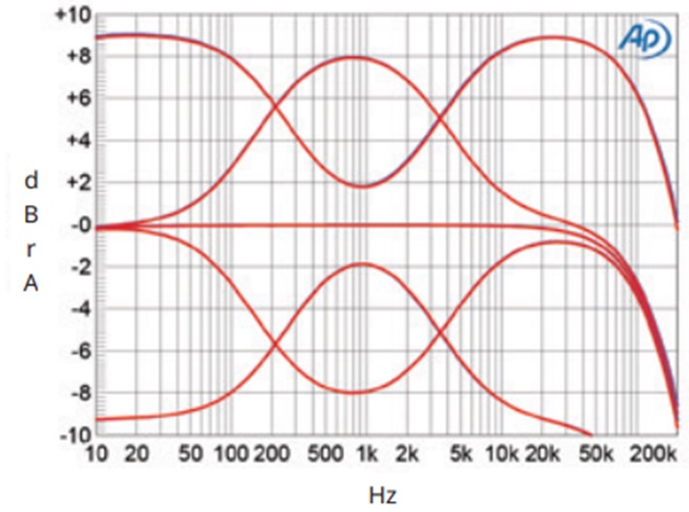 A fenti ábra mutatja a hangszín szabályzó áramkörök működését. A Line Straight kikapcsolt állapotában, azaz amikor a jel áthalad a szabályzó áramkörökön, és minden szabályzó elemet a minimumtól a maximumig elforgatok, a teljes átvitel 200 kHz-felső határértéken -6 dB-re csökkent. A mély és magas hangszín szabályzási tartománya 9 dB, a közép tartományé pedig 8 dB, ahogy az ábráról is leolvasható.