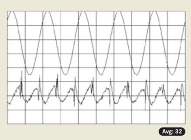 Az ábrán erős csillapítással ugyan, de mérhető mértékben megjelenik a hálózati trafó mágneses interferenciája.