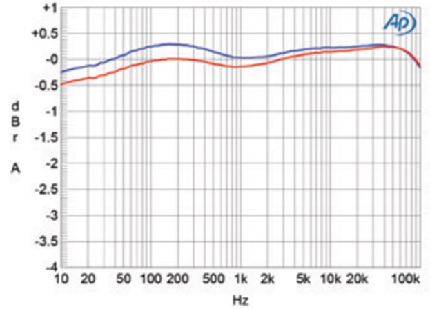 A fenti ábrán az MM phono frekvencia átvitelét láthatja RIAA korrekció után. Bal csatorna kék, jobb csatorna piros. Skála: 0,5 dB.