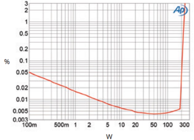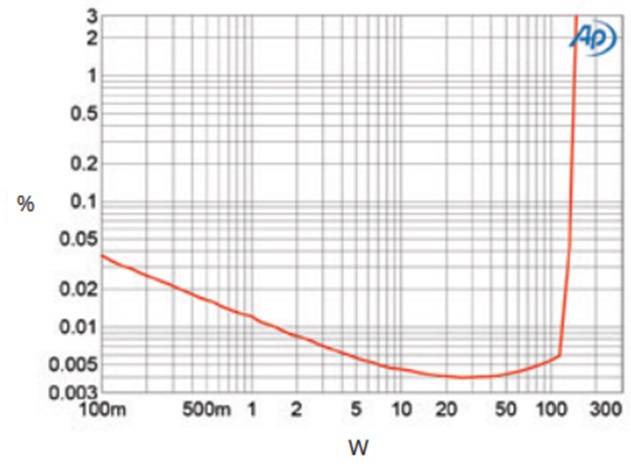 8 ohm terhelésen a legalacsonyabb torzítás 30 W értéken mérhető. A torzítás mértéke nagyon alacsony marad a védelem beavatkozásáig.