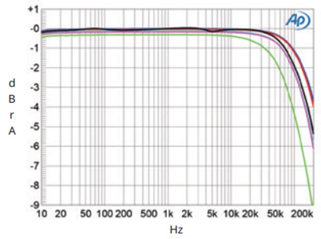 2,83 V szimulált hangfal terhelés mellett a szürke, 8 ohmos terhelésen a bal csatorna kék, a jobb piros, 4 ohm terhelésen a bal a cián, a jobb a magenta színnel mutatja a frekvencia átvitelt. A zöld a 2 ohmos terhelés átviteli tartományát mutatja.
